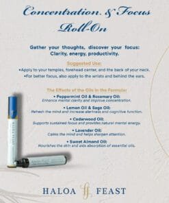 Haloa Feast Focus & Attention Roll-On is specially crafted to enhance mental clarity and focus. Peppermint and sage oils reduce mental fatigue, while lemon and rosemary oils refresh your mind and energize your spirit.