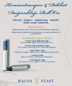 Haloa Feast Konsantrasyon & Dikkat Dağınıklığı Rollonu, zihinsel netlik ve odaklanma sağlamak için özel olarak tasarlandı. Nane ve adaçayı yağları zihinsel yorgunluğu azaltırken, limon ve biberiye yağları zihninizi tazeler ve enerji verir.